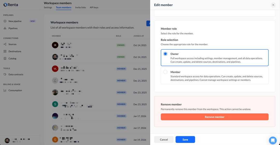 Renta uses a Role-Based Access Control (RBAC) model to manage user access and security. This system allows you to collaborate on data pipelines within isolated environments called Workspaces.